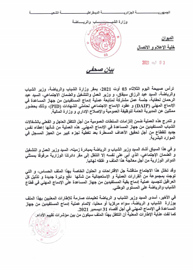 جلسة عمل مشتركة لمتابعة عملية إدماج المستفيدين من جهاز المساعدة في الإدماج المهني (DAIP) و عقود الإدماج الاجتماعي لحاملي الشهادات (PID)admin3 août 2021Communiqués de presse Nombres de vues : 14