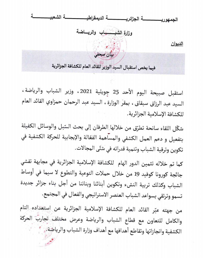 فيما يخص استقبال السيد الوزير للقائد العام للكشافة الجزائريةadmin25 juillet 2021Communiqués de presse Nombres de vues : 13