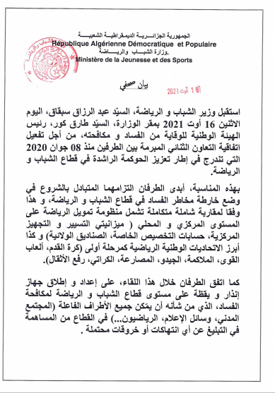 وزير الشباب والرياضة يتعهد بوضع خارطة طريق لمكافحة الفسادadmin16 août 2021Communiqués de presse Nombres de vues : 15