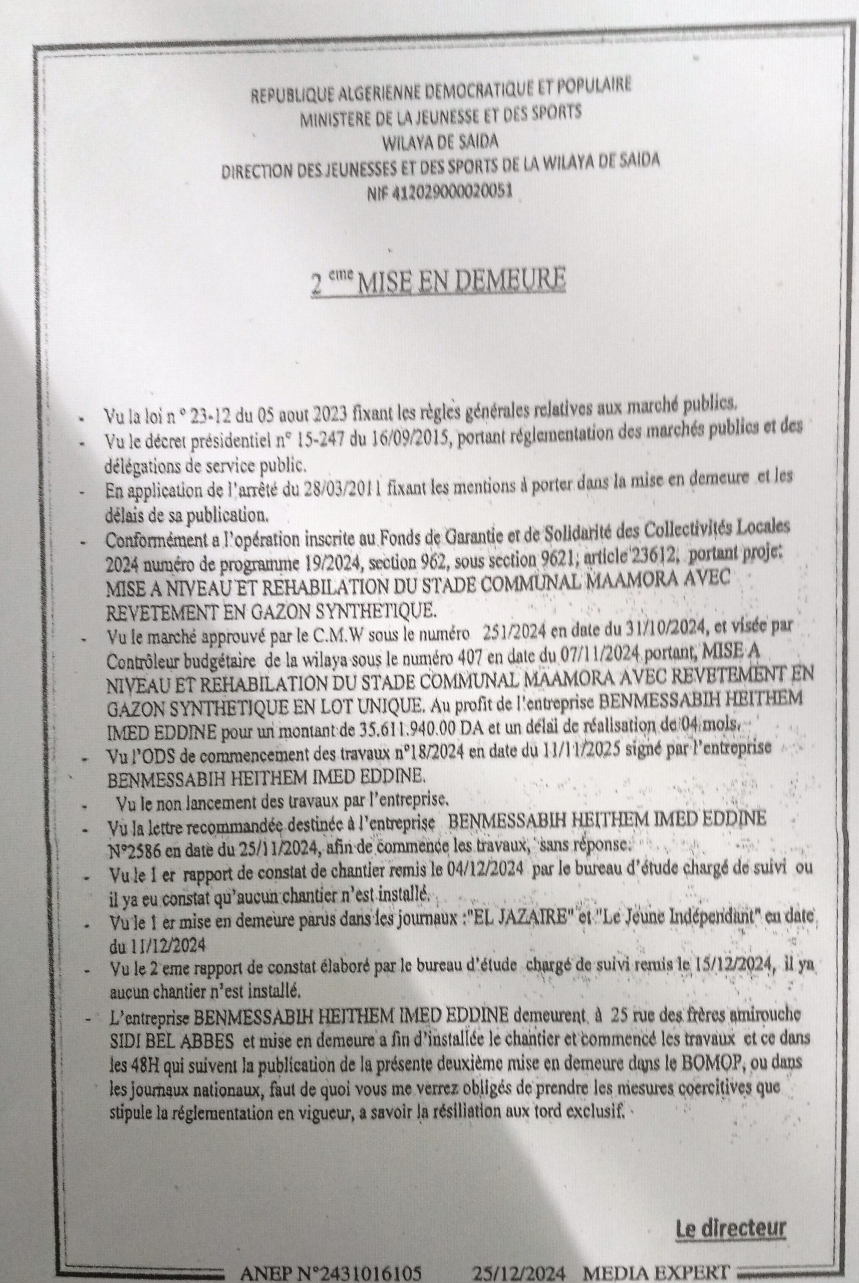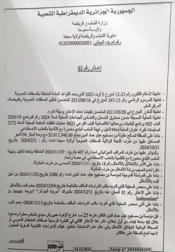 اعذار رقم 02 لمقاولة انجاز مشروع إعادة تأهيل و تهيئة الملعب البلدي”ولاية سعيدة” مع التكسية بالعشب الاصطناعي “بن مصابيح هيثم عماد الدينadmin2 يناير 2025المناقصات عدد المشاهدات : 60
