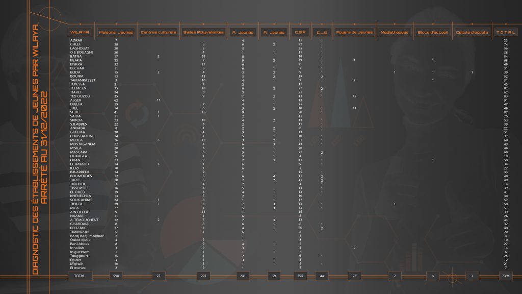Etablissements de Jeunes par wilaya arrêté au 31/12/2022admin10 juillet 2023Etablissements de Jeunes Nombres de vues : 43