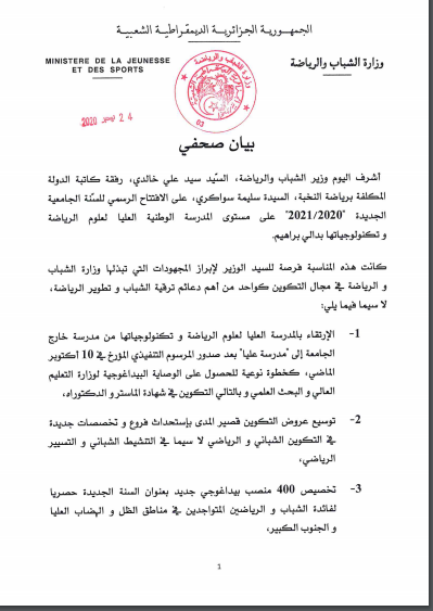 L’ouverture officielle de l’année universitaire 2020/2021 de l’école nationale supérieure en science et technologie du sport ENS/STS Dely Ibrahimadmin24 décembre 2020Communiqués de presse Nombres de vues : 28