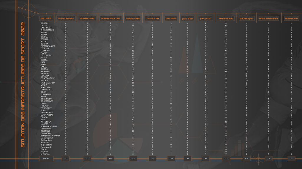 Situation des Infrastructures de Sports par Wilaya 2022admin10 juillet 2023Infrastructures sportives Nombres de vues : 28